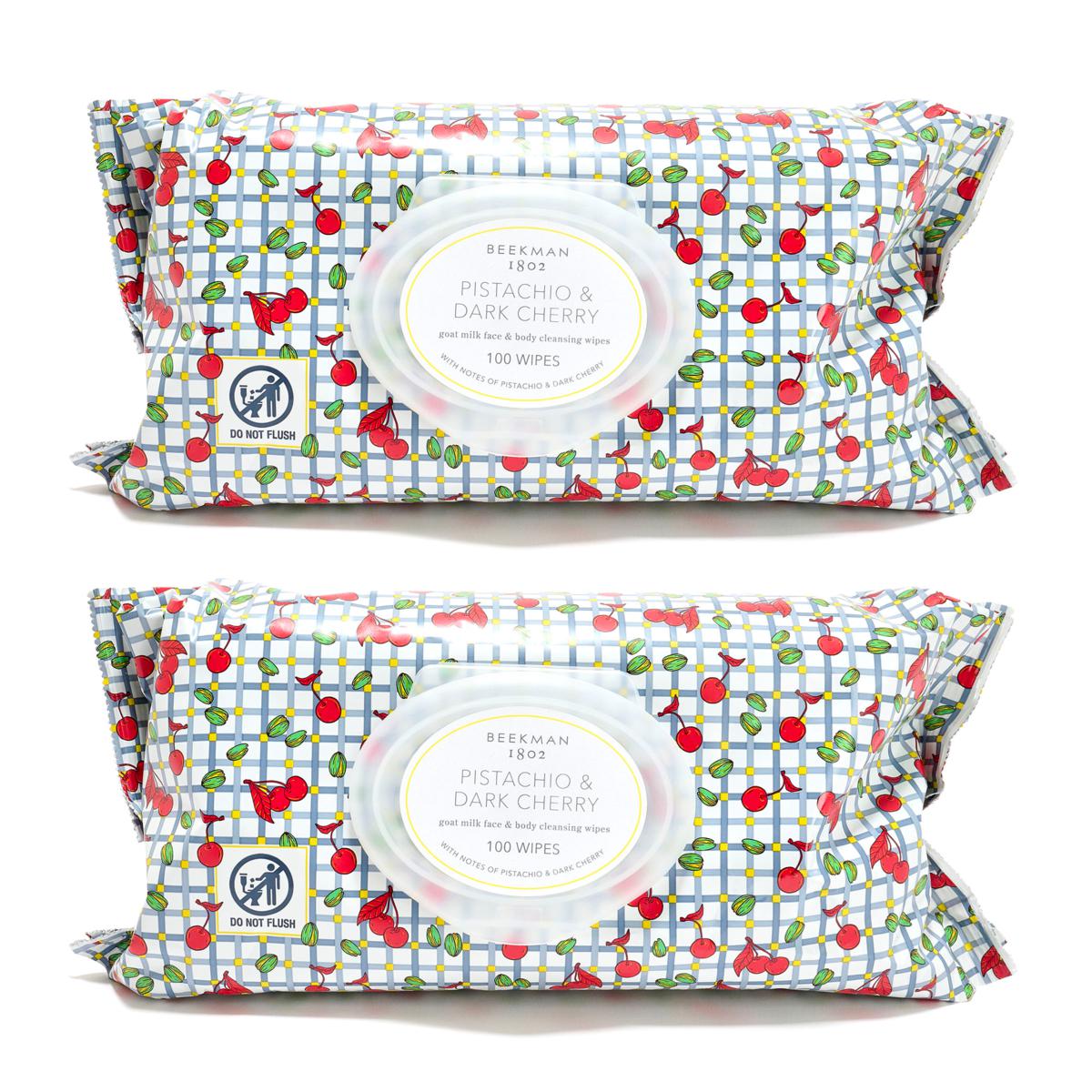 - (2) 100-count Pistachio Dark Cherry face wipes