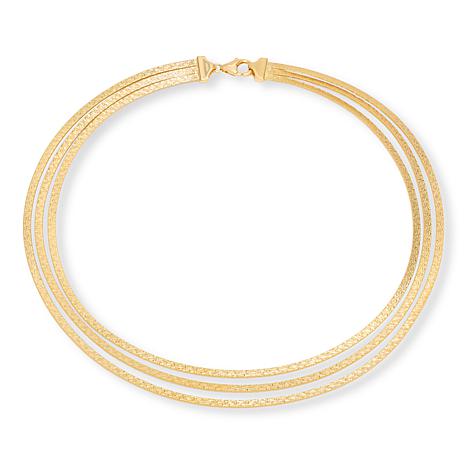 Make a chic, stylish statement when you accessorize with this beautiful, multi-strand Omega chain necklace. The versatile piece features three chains arranged in graduated lengths, with a polished finish on one side and diamond-cut texture on the other. Simply flip it over to change up your look!