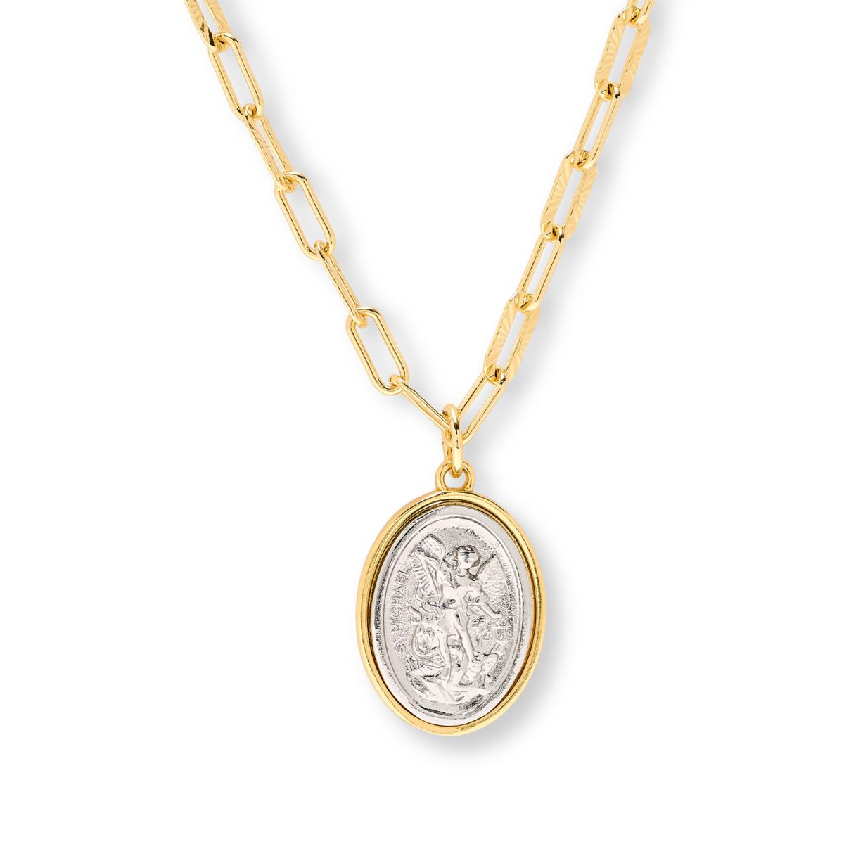 Carry a timeless symbol of protection and courage with this striking pendant and chain necklace. Featuring Saint Michael the Archangel in a two-tone finish, the design highlights the celestial warrior's strength and determination. Perfect for adding a meaningful touch to your everyday style or gifting to someone special.