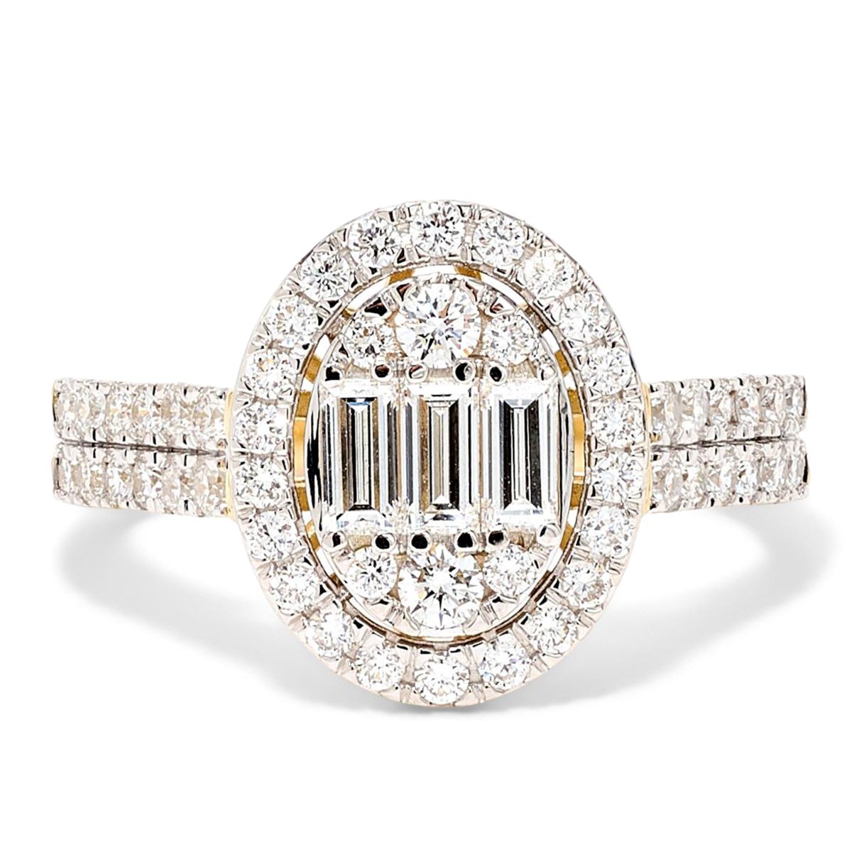 - Rhodium-plated 14K gold cluster ring of lab-grown diamonds in round and baguette cuts