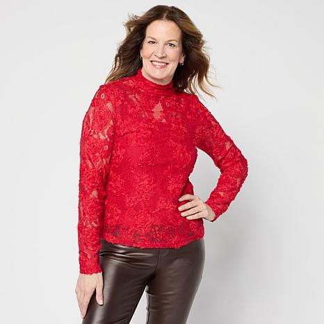 This stunning long-sleeve top features intricate 3D lace appliqué with a knit fabric-lined body for comfort and coverage. The keyhole closure with three dyed-to-match faux pearl buttons adds a delicate, feminine touch. Perfect for dressing up your holiday wardrobe or adding a chic layer to your everyday look.