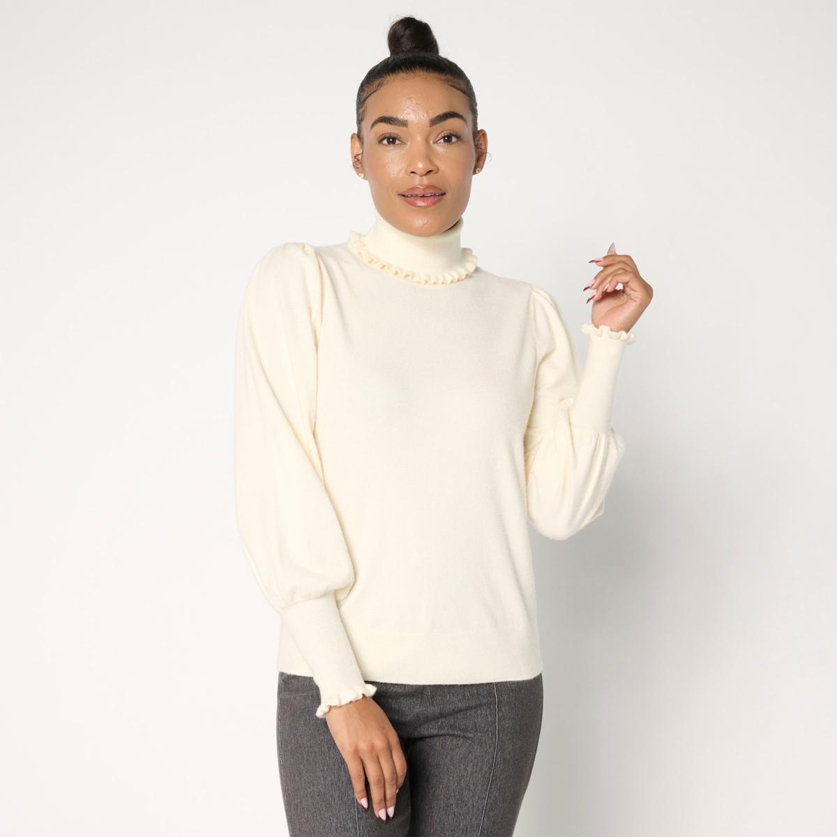 Style and comfort in one warm, cozy package. This turtleneck sweater with ruffle detail and long, blouson sleeves is easy to wear and versatile enough to take jeans to a more elevated look, or to dress up with tailored trousers or a skirt.