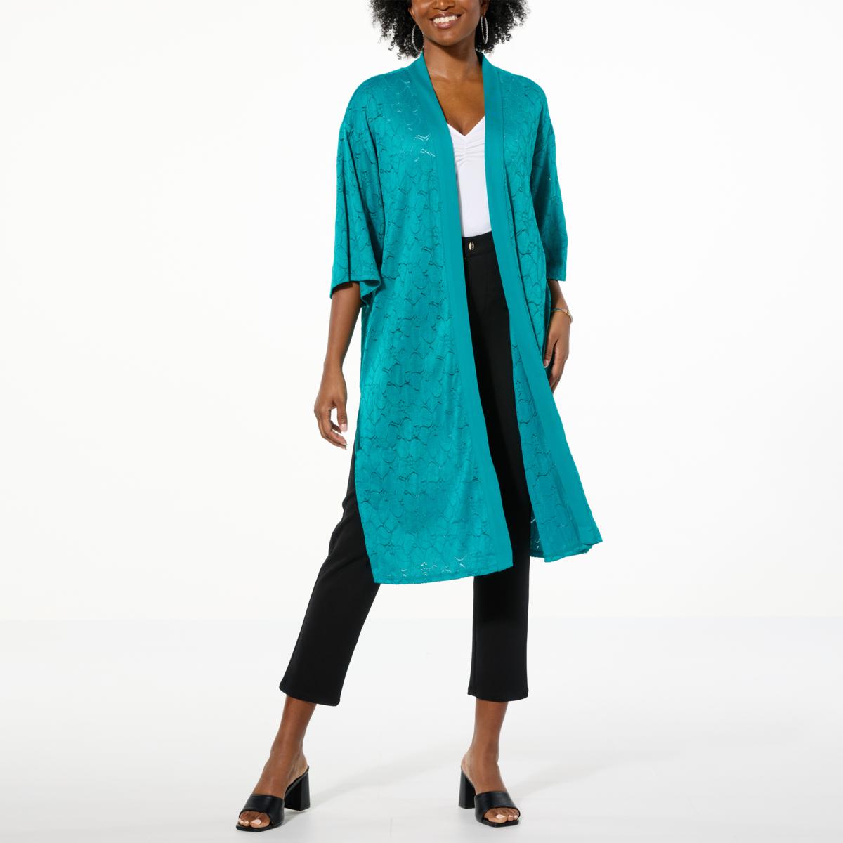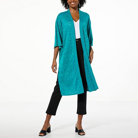 Around town or around the house, this lacy and stylishly banded, kimono-style topper easily enhances your favorite everyday looks.