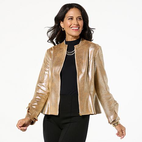 This C Wonder stunner is a head turner. This jacket features metallic scuba knit and unique ruffle detail that combines for a look that's simply divine. Available in average and petite lengths, this garment is designed for every body.
