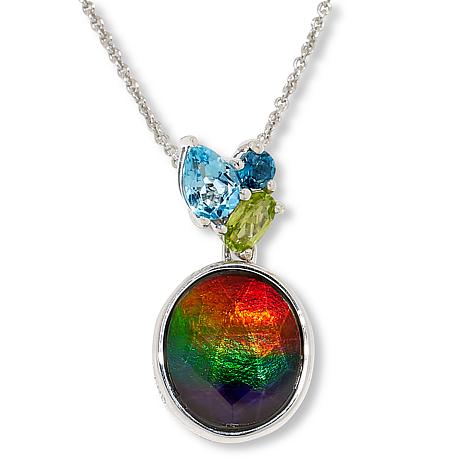 - Pendant has bezel-set, oval multicolor ammolite/quartz triplet topped with cluster of prong-set blue topaz and green peridot stones