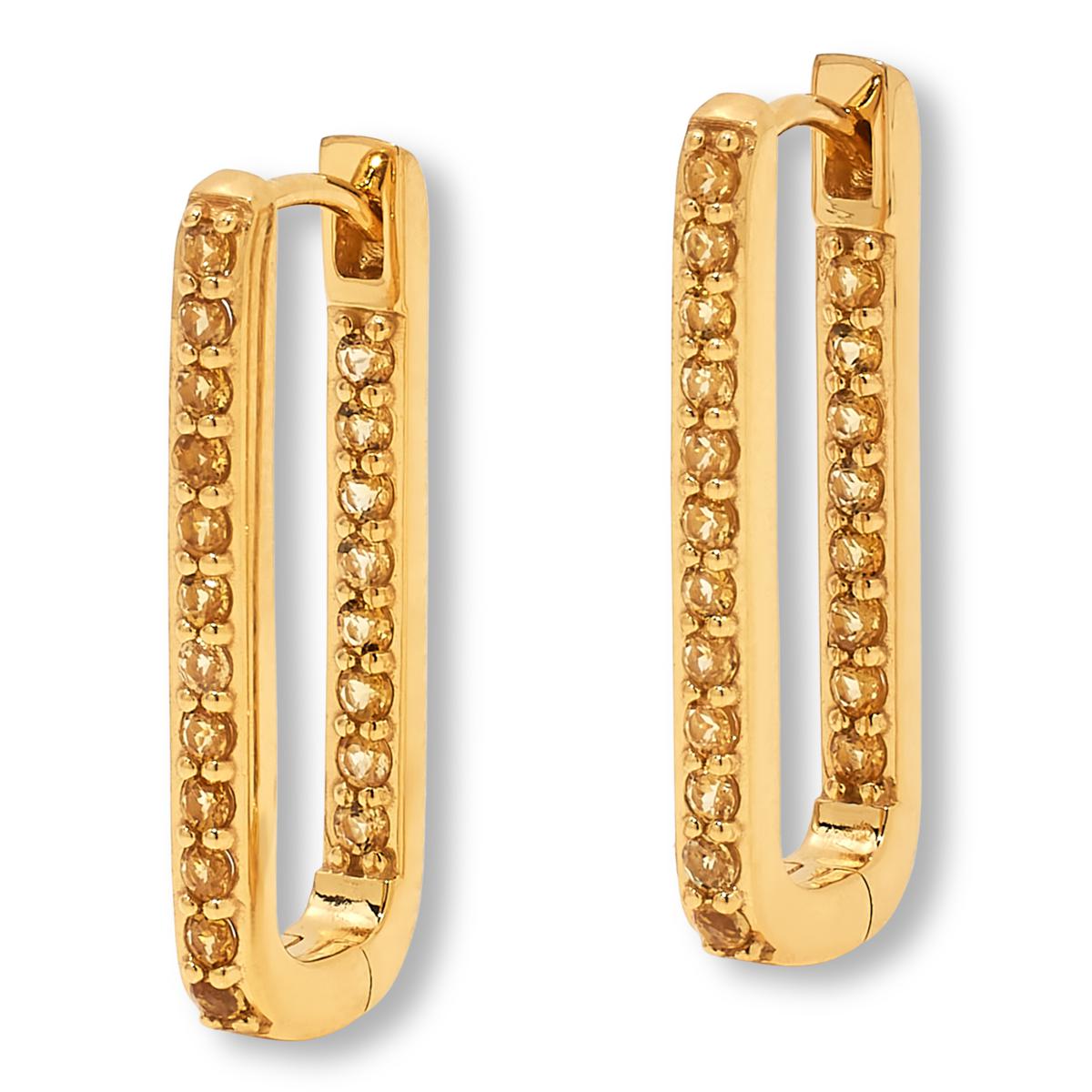 - Elongated rectangular hoop earrings with round gemstones along front and inside back