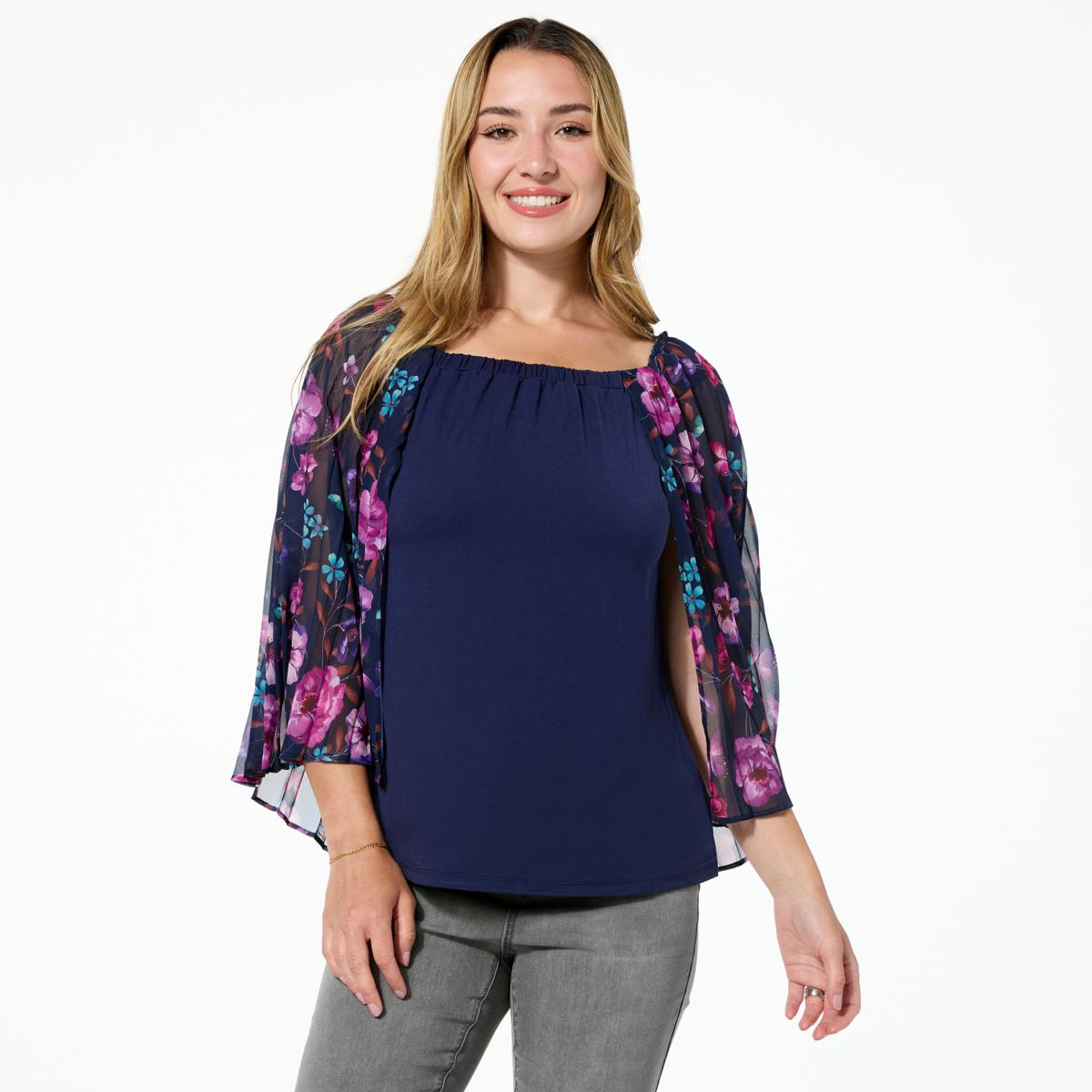 This off-shoulder top wears like a cool breeze. Between the solid stretch jersey knit tank and the printed chiffon cape, it's exactly what you'll want to wear when you want to show off your savvy sense of style. Toss on this twofer-designed top with light-wash denim for the perfect warm-weather combo.