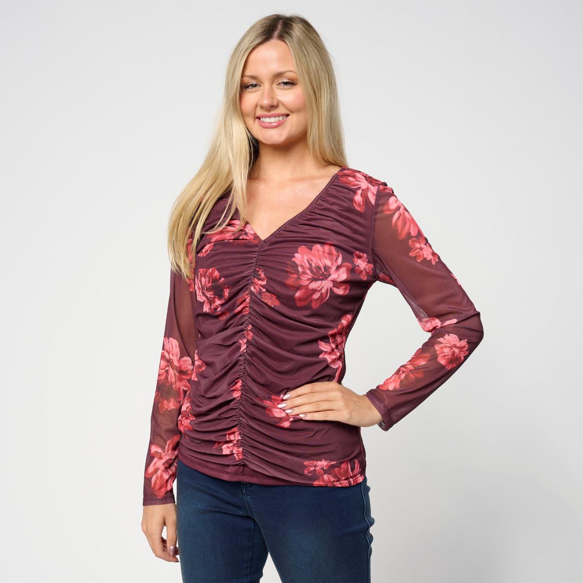 Colleen Lopez Printed Ruched Mesh Knit Top