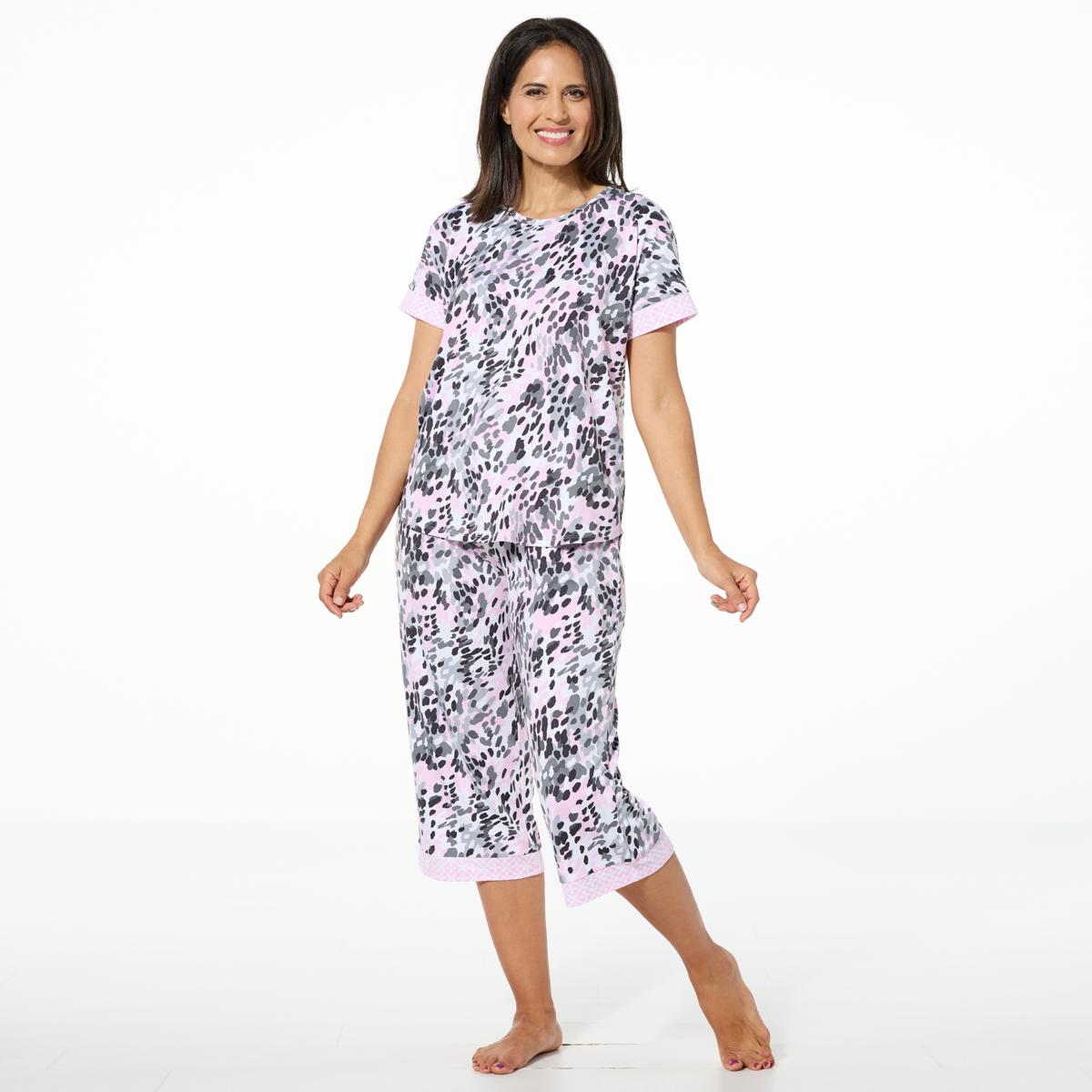 Bedtime just got a lot more stylish with this twin-print pajama set from Comfort Code. As comfy as it is cute, this two-piece sleep set comes with a short dolman-sleeve top crafted out of the softest, peached jersey knit fabric that matches back perfectly to the slim-leg, pull-on lounge pants.