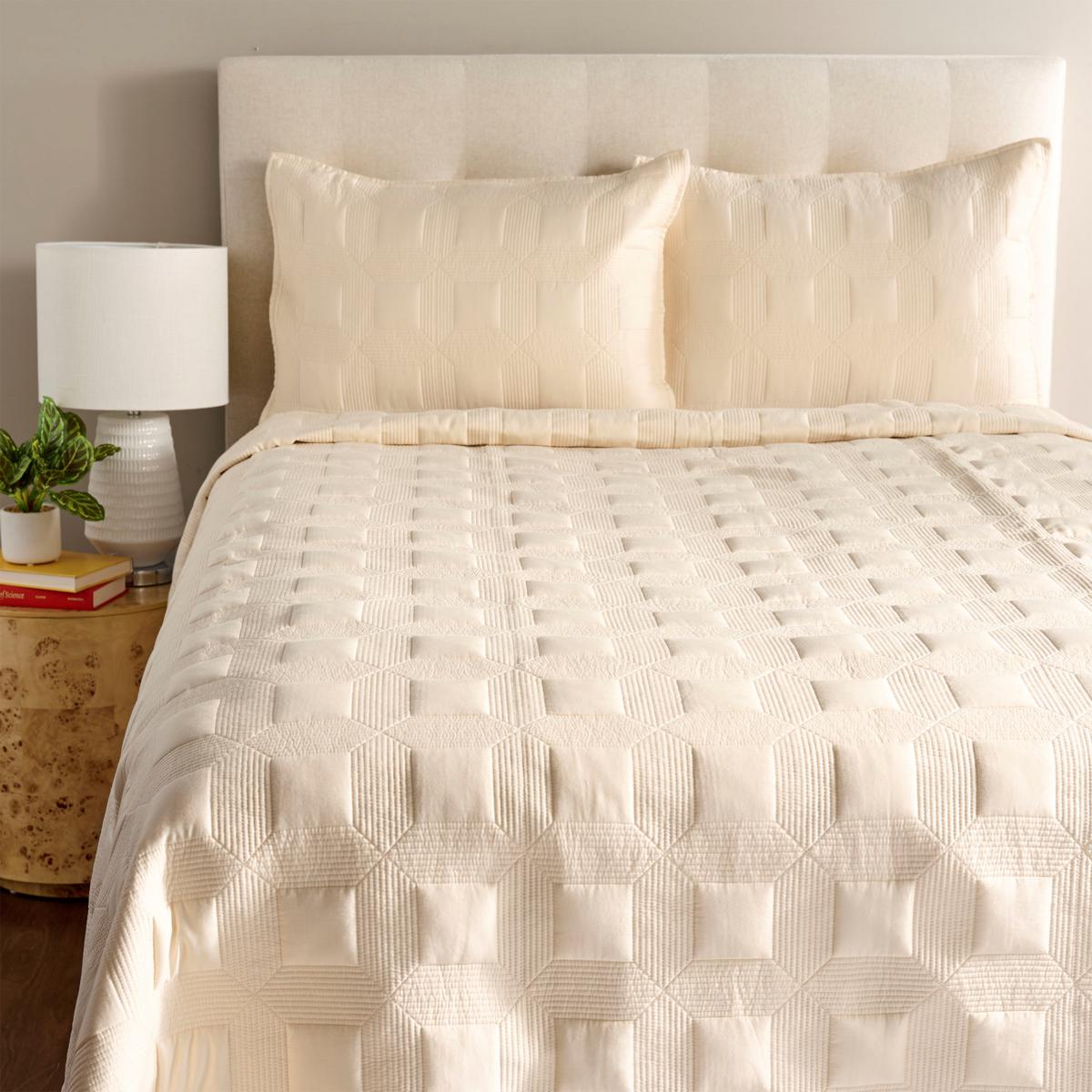 Elevate your bedroom with this modern and timeless classic cotton quilt set featuring all over box stitching. The embroidery quilting creates a beautiful high/low texture for a stunning look.