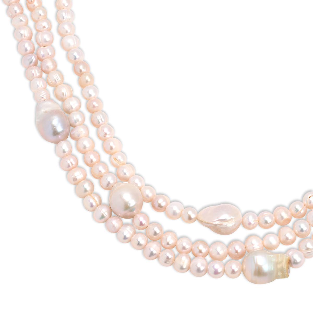 This modern three-strand freshwater pearl necklace blends classic elegance with organic texture, making it perfect for both elevated everyday wear and special occasions. The multi-layered design offers a luxurious look without the hassle of stacking multiple necklaces. Its warm gold-tone details and adjustable fit ensure comfort and style from day to night.