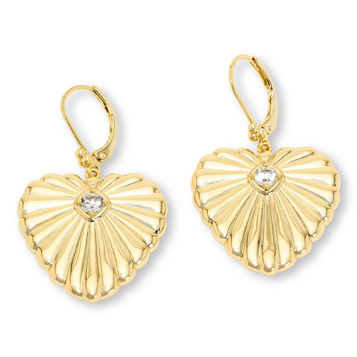 These charming heart-shaped earrings bring a touch of sparkle to your everyday look with their brilliant white topaz stones. The polished gold-tone finish adds warmth and elegance, making them perfect for both casual and dressy occasions. The secure leverback closure ensures comfortable wear all day long.