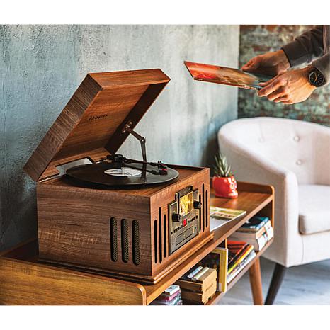 Give analog music the encore it deserves with the Musician's three-speed turntable, housed in a beautiful hardwood cabinet finished with rich veneers. The vintage-inspired style sports modern technology, with a CD player, cassette deck, AM/FM radio and even a built-in Bluetooth receiver, so you can jam your digital tracks wirelessly.