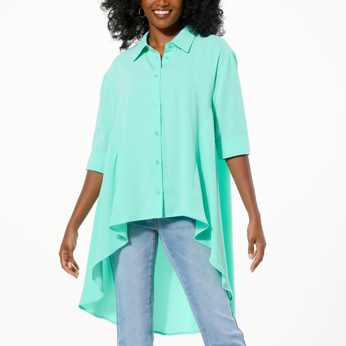 Make a grand entrance (and exit) in this head-turning crepe blouse from Diane Gilman. Designed with a back-of-knee-grazing (so it covers your bum) hemline in the back and a dramatically higher (but not belly-button showing) front that gives off showstopping, double-take vibes any time you wear it.