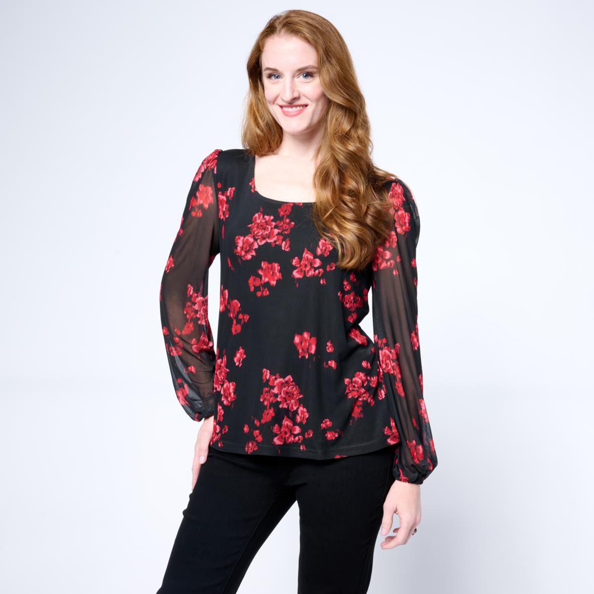 Like a beacon of light, this lantern-sleeve top calls attention to your sweet, savvy style with printed, lightweight stretch mesh knit fabric. It's the perfect upgrade from boring tees or basic blouses.