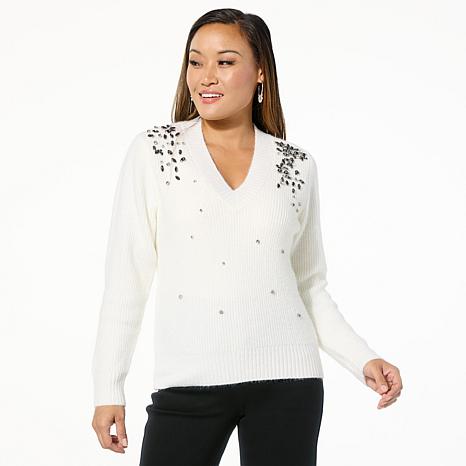 DG2 by Diane Gilman Rhinestone Embellished V-Neck Sweater