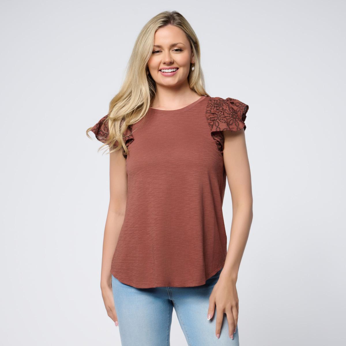 Elevate the classic everyday tee with this mixed media version crafted from a soft slub knit cotton blend fabric and framed by ruched, woven eyelet flutter sleeves.