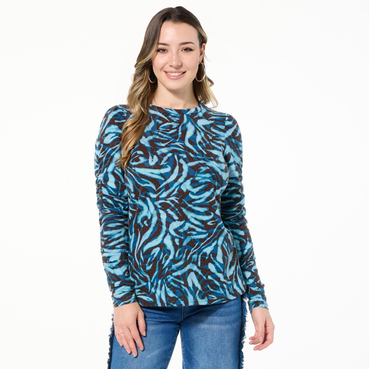 Give your wardrobe a lift with this brushed sweater knit top with ruched sleeves from Diane — an elevated take on a classic forever favorite with bold colors and prints.