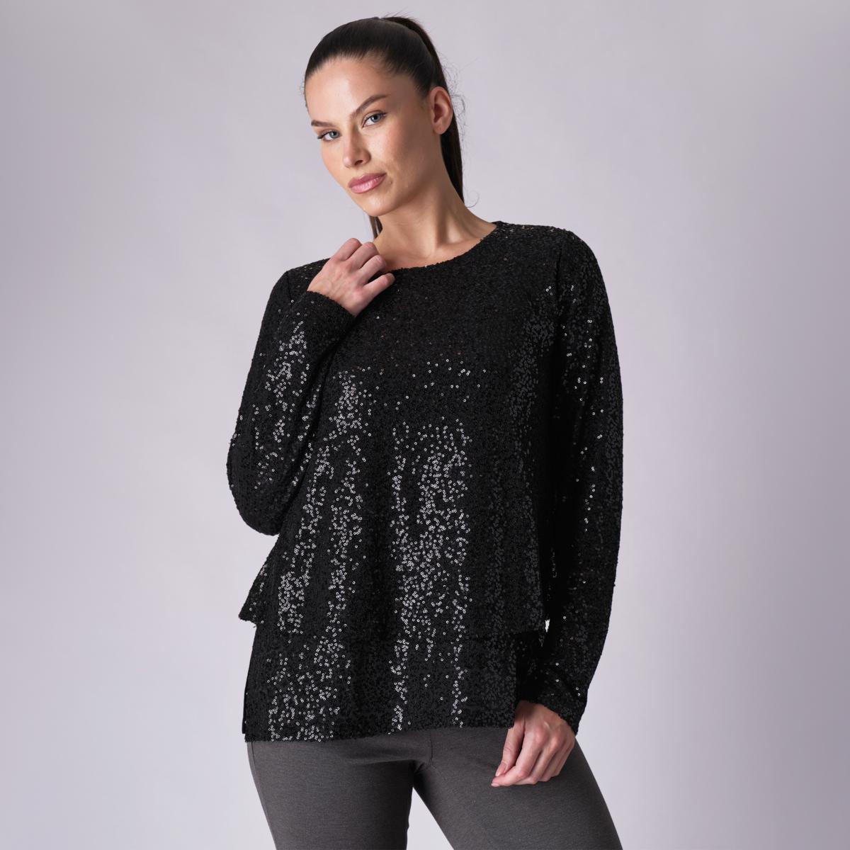 Shine bright in this effortlessly chic top featuring a double-layered front with dazzling sequin fabric and a comfortable knit back. Perfect for holiday parties or a night out, it offers a flattering fit with side slits for ease of movement. Pair it with your favorite jeans or dress pants for instant glam.
