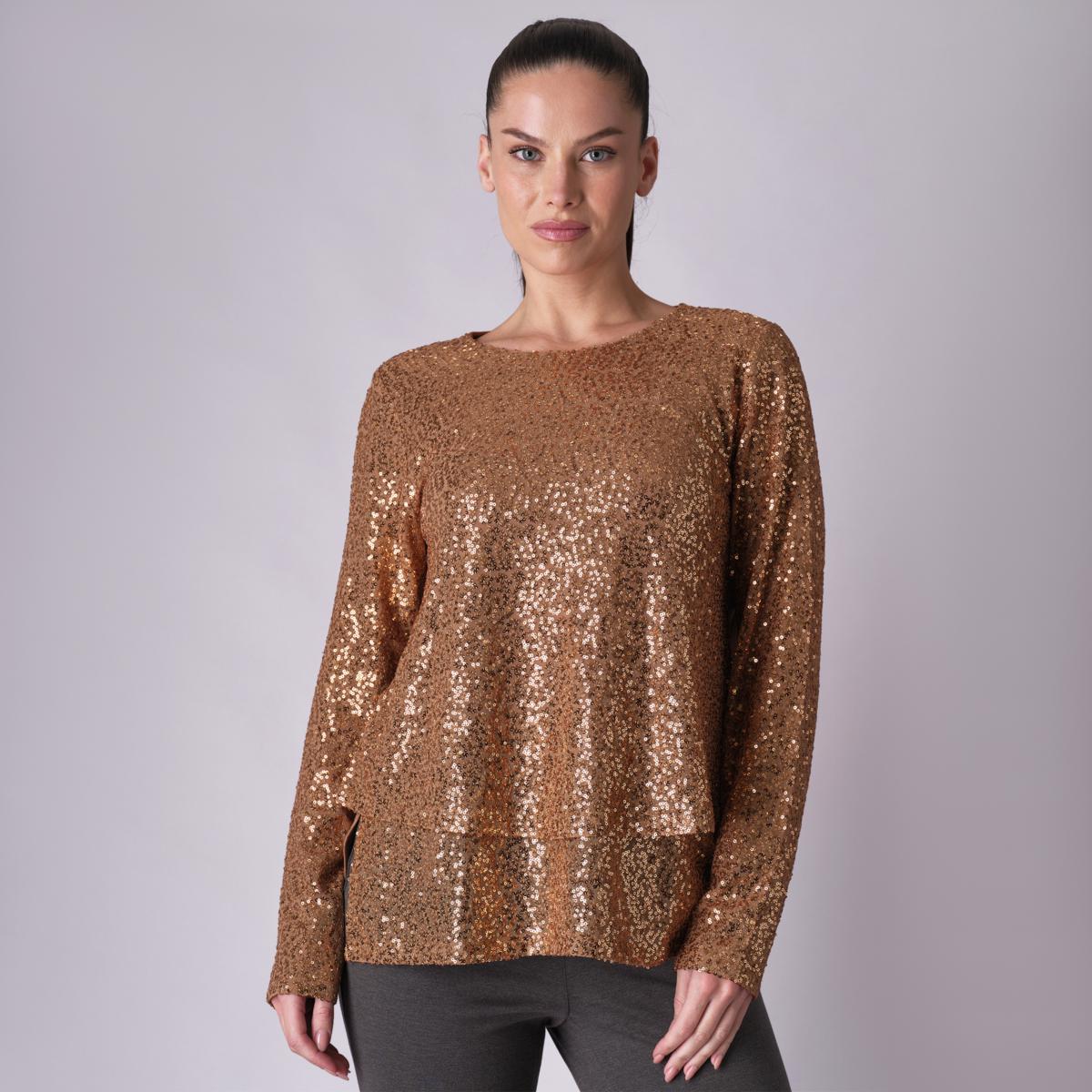 Shine bright in this effortlessly chic top featuring a double-layered front with dazzling sequin fabric and a comfortable knit back. Perfect for holiday parties or a night out, it offers a flattering fit with side slits for ease of movement. Pair it with your favorite jeans or dress pants for instant glam.