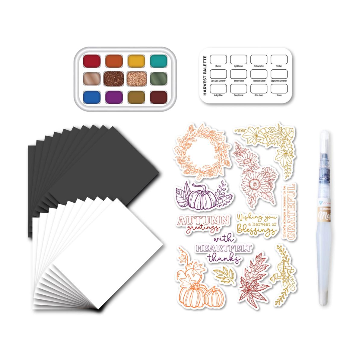 Be inspired by this all-inclusive kit that is perfect for autumn crafting and more. Watercolors include 10 harvest colors as well as 2 glitter colors, and stamps include sentiments, harvest flowers, pumpkins and more.