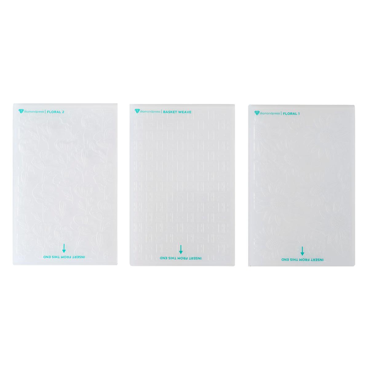 - (3) 5.75" x 8.75" x 0.25" Embossed folders: Floral 1, Floral 2 and Basket Weave