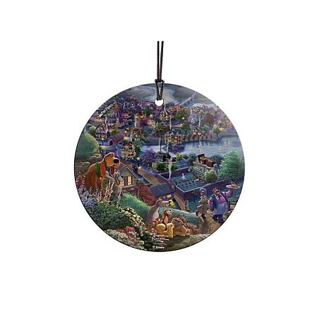 A heartwarming scene from Lady and the Tramp comes to life in this vibrant hanging glass decoration, where beloved characters gather for a memorable moment filled with music, friendship, and a dash of adventure. Trusty and Jock look lovingly in the distance while the pups from the pound appear to be howling a tune. Joe plays his instrument following Tony up the hill with their finest spaghetti from the famous Tony's Restaurant. Further in the distance, you can see Darling and Jim Dear appearing to be searching for their lost pup. Thomas Kinkade's artistry brings the animated classic to your holiday tree, inviting memories of cherished films and family traditions.