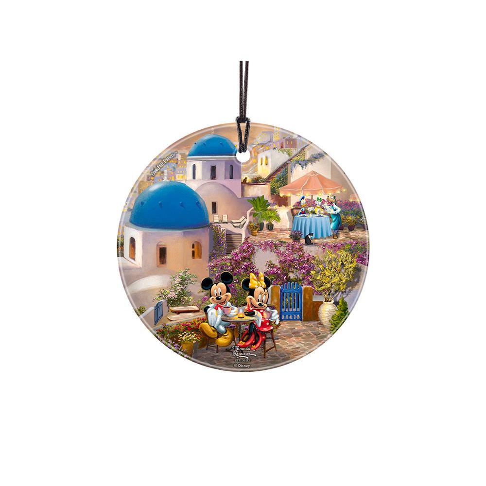 Mickey and Minnie take on Greece! This 3.5" circular hanging glass print features a romantic scene between Mickey and Minnie Mouse in Santorini, Greece with friends Donald and Daisy in the distance and Goofy serving as their waiter.