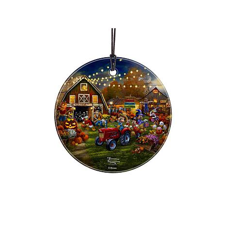 Celebrate the magic of fall with this officially licensed StarFire Prints Hanging Glass Print featuring Mickey Mouse and friends enjoying a festive autumn harvest scene. Artwork by Thomas Kinkade Studios, this round collectible showcases beloved Disney characters surrounded by glowing pumpkins, fall flowers, and a charming barnyard lit with string lights. The vibrant colors and intricate details are permanently fused into the glass, allowing light to illuminate the artwork from every angle.