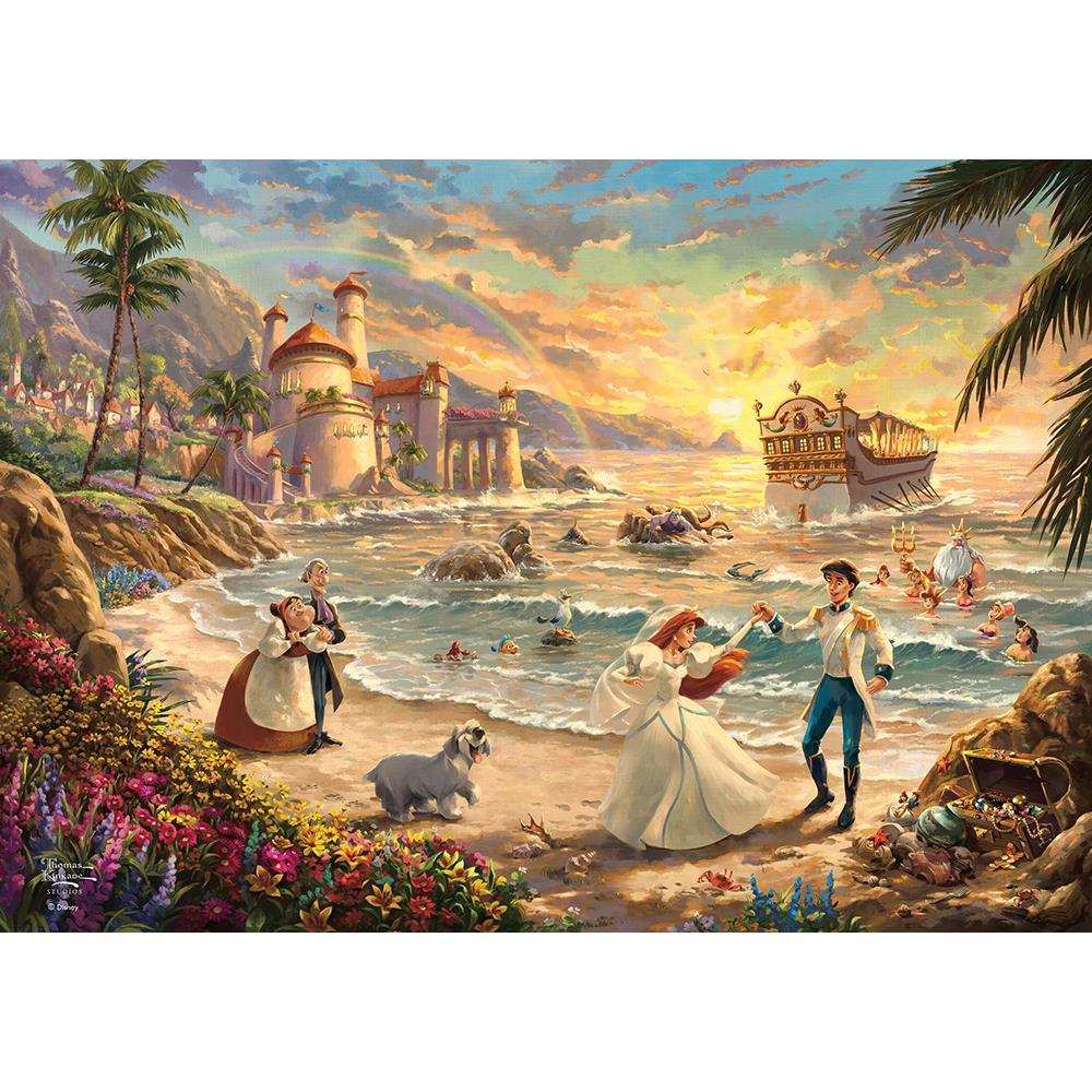 Love meets between land and sea. This 24" x 17" MightyPrint Wall Art features The Little Mermaid's Princess Ariel and Prince Eric celebrating their love on the shore. They are getting married, surrounded by their loved ones on land and in the sea! This magic scene is complete under a sunset sky with a rainbow.
