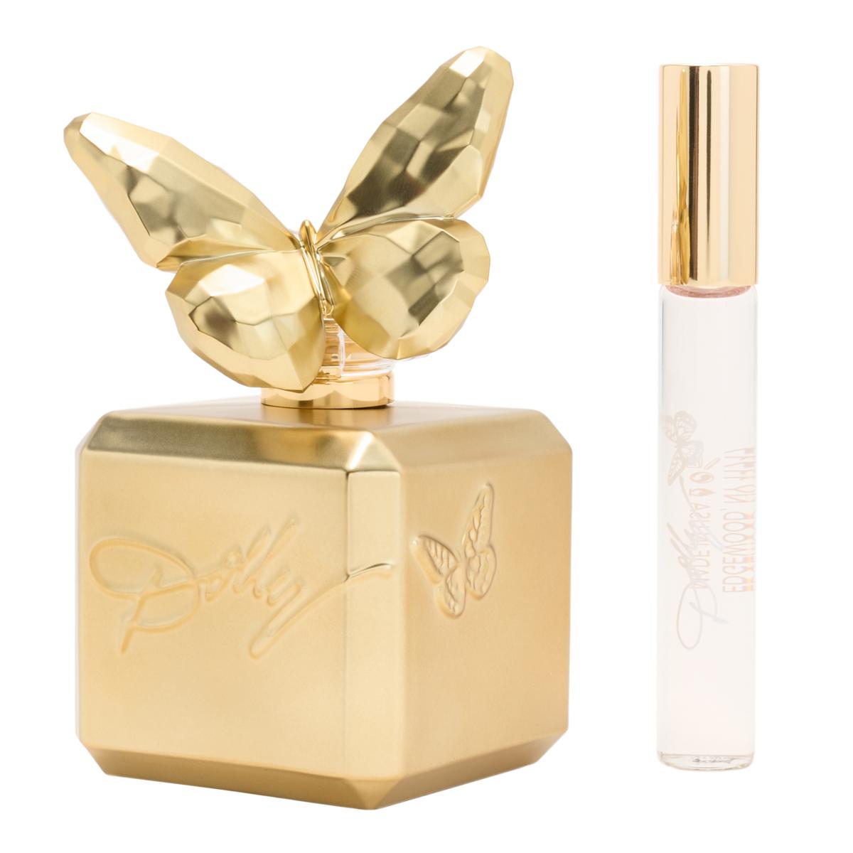 - The extrait de parfum is housed in a stunning, gold-finish bottle featuring Dolly's iconic signature and her other "signature": a butterfly, crafted with gleaming gold facets, perched on top
