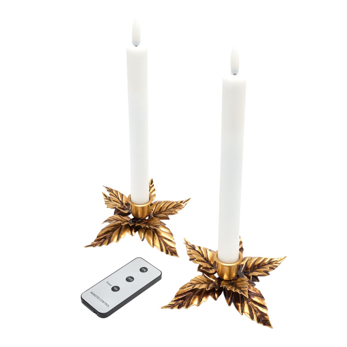 Brighten up your space with these elegant candle holders from Emryn House. Perfect for a mantel or table, this set includes two flameless LED tapers for a perfect look.