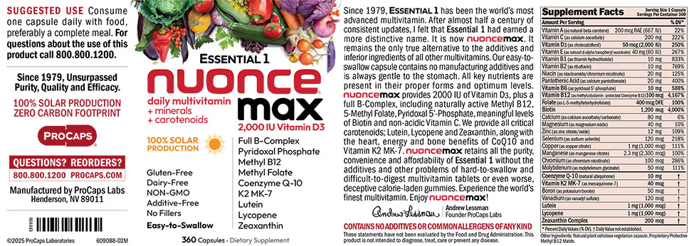 Essential One Nuonce Max provides all the convenience and affordability you seek in a multivitamin in an easy-to-swallow capsule, without the stomach upset and additives.