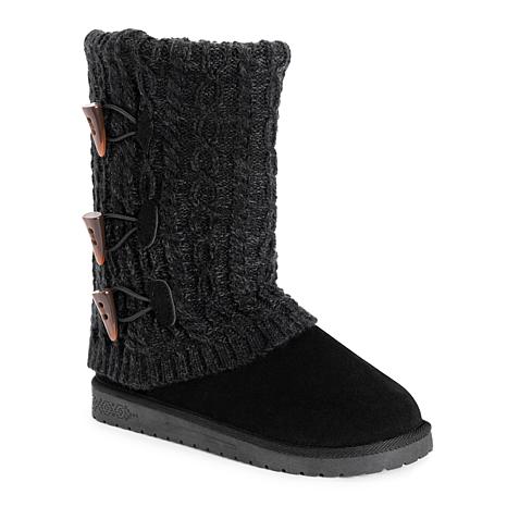 Essentials by MUK LUKS® Women's Cheryl Boots can’t be beat. Cozy sweater knit design and soft faux fur lining blends everyday comfort with on-trend style. Wipe with a damp cloth to clean, no bleach, lay flat to dry. Imported. Water resistant, Stone, Grey, Jet Black, Brown Java, or Burgundy. Women’s whole sizes 6-11. Half sizes size up.
