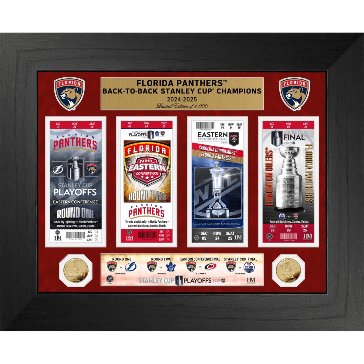 Celebrate the Florida Panthers' 2025 Stanley Cup Championship with a limited-edition keepsake illustrating the team's road to victory! This officially-licensed piece showcases commemorative tickets representing each postseason series, including the Stanley Cup Final, in an attractive 2" wide wood frame. Featured alongside the tickets are two 39mm gold-plated minted coins: one honoring the Stanley Cup Champions and the other a dueling Stanley Cup Final Game Coin. A unique, must-have keepsake for Panther's fans!