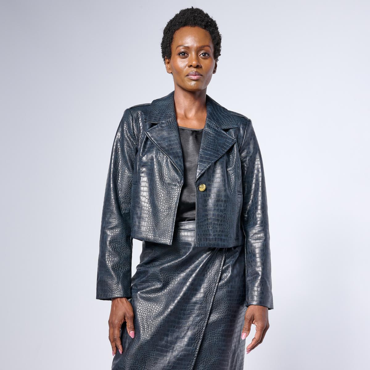A classic, this cropped jacket with inseam welt pockets is a style you'll fall in love with. Leather-inspired croco embossing gives the look an elegant edge that you can style with all kinds of outfits.