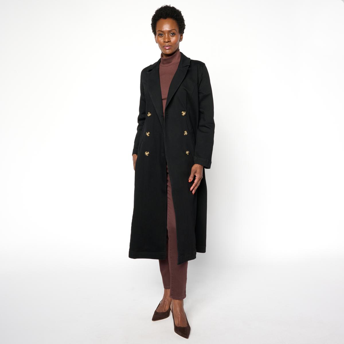 Step out in style with this unlined denim trench featuring a double-breasted closure and peak lapels for a classic look. The princess seams and center back vent add a flattering silhouette, while the functional button cuffs and welt pockets bring practical details. Perfect for layering over your favorite outfits, this trench combines timeless design with everyday versatility.