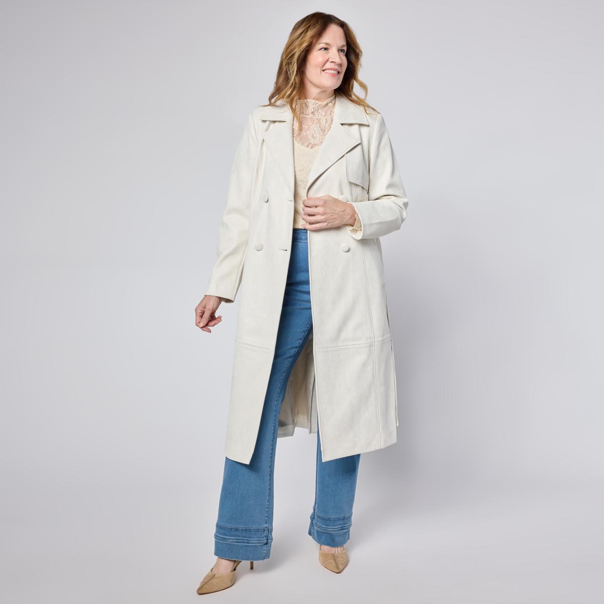 This chic trench coat features a double-breasted front with self-covered shank buttons and a notch collar for timeless style. The long sleeves and self belt add a flattering silhouette, while the fully lined interior and back vent ensure comfort and ease of movement. Perfect for layering on cooler days, this coat effortlessly elevates any outfit with its sleek faux leather finish.