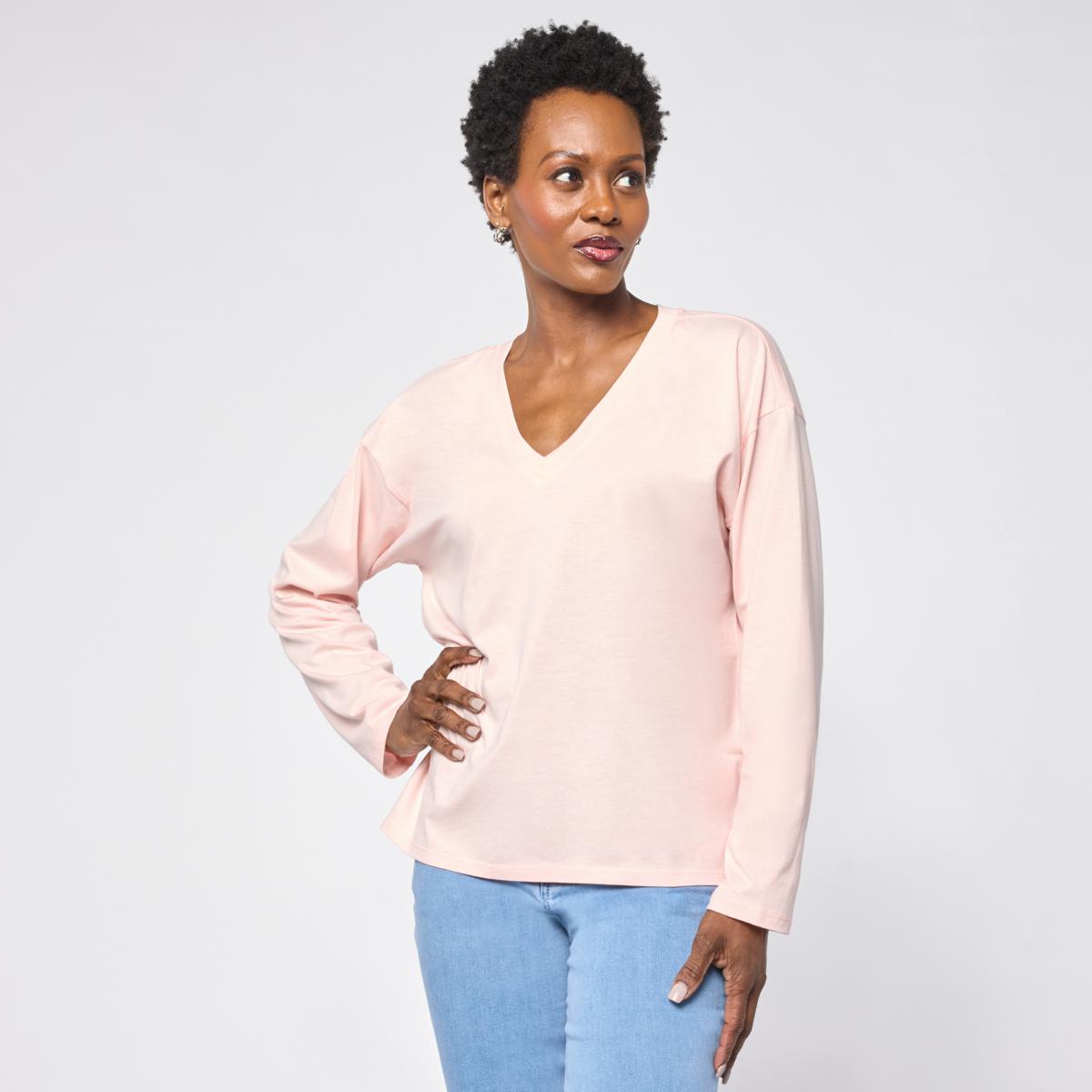 This cozy pullover features a flattering V-neck and stylish high-low hem, perfect for layering or wearing solo. Its drop shoulders and long sleeves offer a relaxed fit that moves with you. Dress it up or down for effortless everyday style.