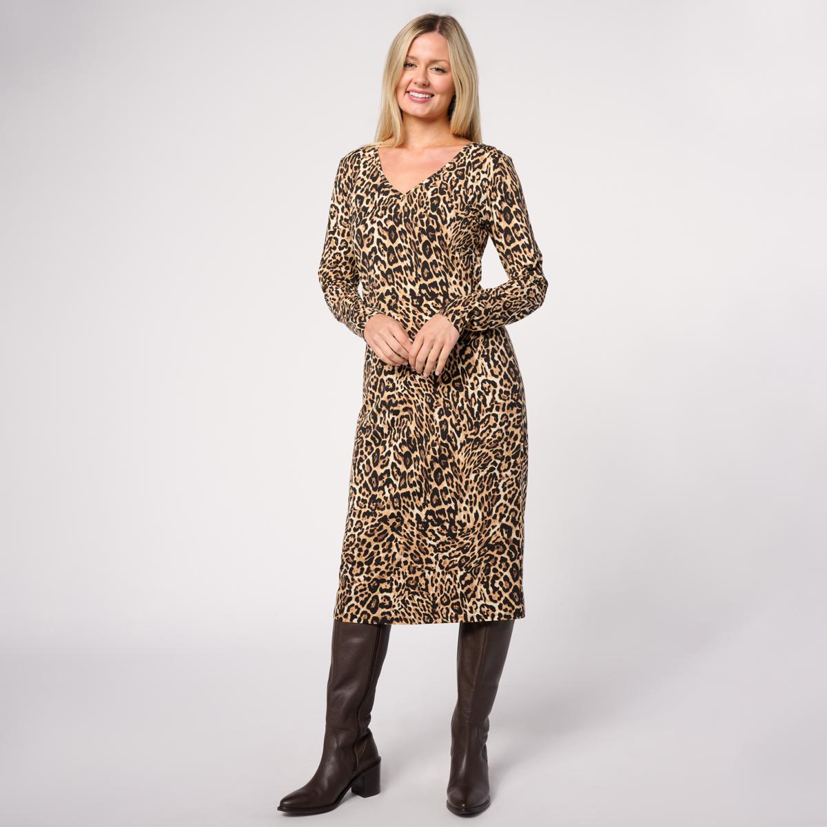 Versatile, comfortable and easy to wear, the midi-length pullover dress is seasonless. Made of a luxe jersey knit, long sleeves and V-neck, it pairs well with a variety of footwear and accessories.
