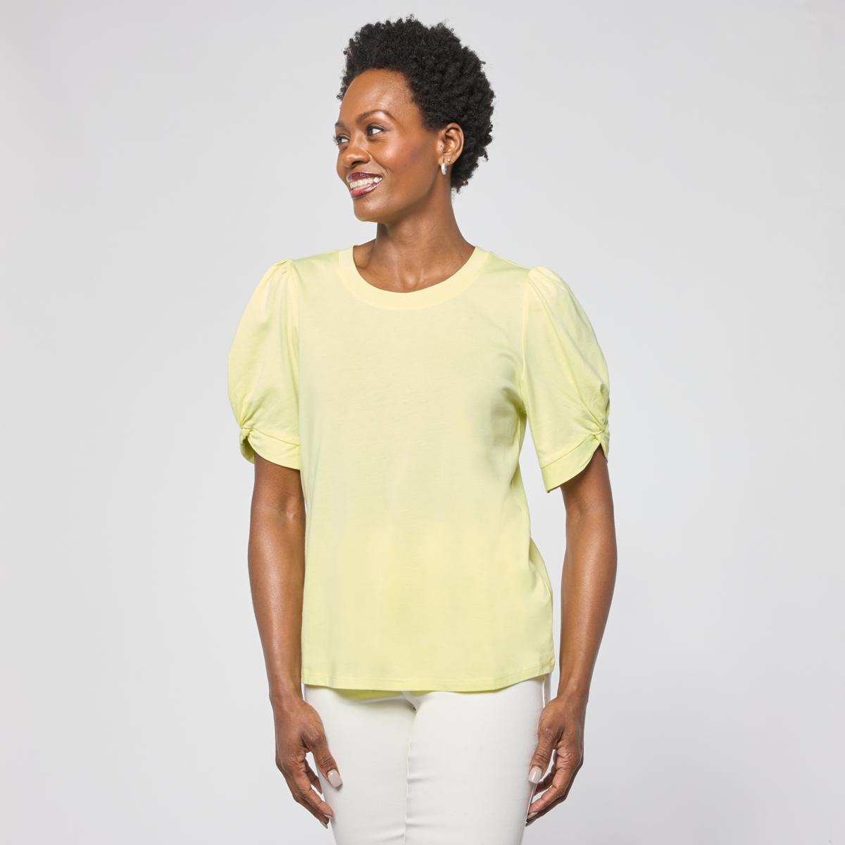 This top features charming knotted short sleeves that add a playful twist to your everyday look. Crafted from a soft slub knit, it offers a comfortable fit with a touch of texture. Perfect for pairing with your favorite jeans or skirts for effortless style.