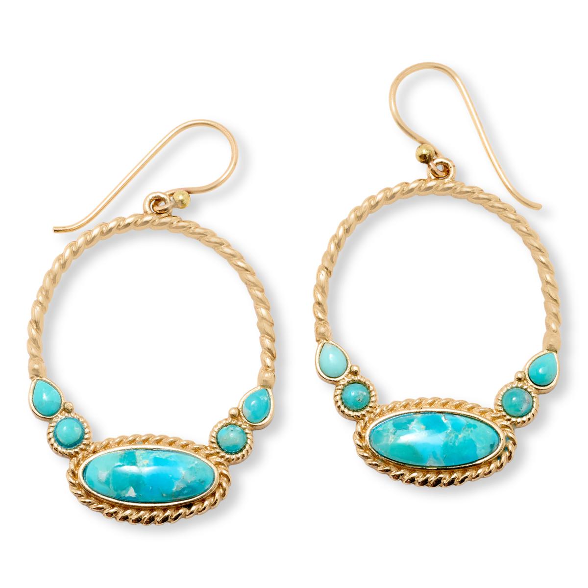 These drop earrings bring a warm, artisanal vibe with their twisted golden bronze and brass detailing. The open silhouette keeps things light and feminine, while the roped gemstone design adds texture and vintage Southwestern charm. Perfect for dressing up your everyday look or adding a unique touch to evening wear.
