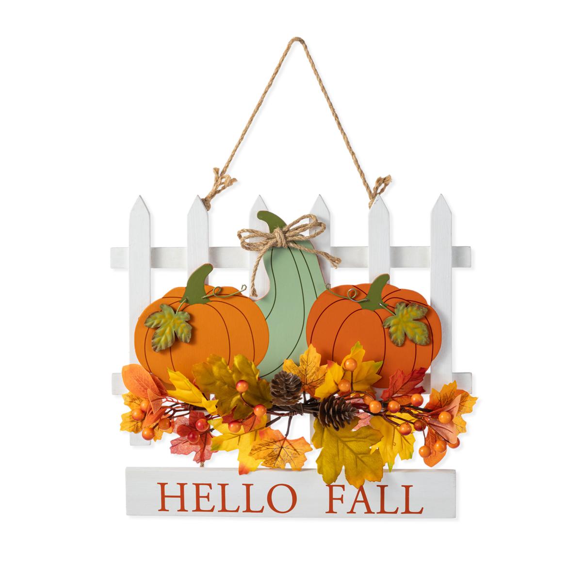 The 14"L Fall Wooden Patch with Floral Door Hanger is a charming and rustic decoration that captures the essence of the autumn season. Crafted from high-quality wood, this door hanger features a white picket fence design, adorned with a variety of colorful pumpkins and a lush arrangement of fall foliage, including leaves and berries, that create a warm and inviting atmosphere. The phrase "Hello Fall" is elegantly displayed, making it a perfect welcoming sign for your front door.