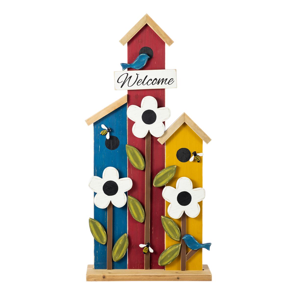 Add a splash of color and charm to your porch, garden, or patio with this delightful birdhouse décor. Featuring three vibrant birdhouses in red, blue, and yellow, accented with white flowers, green leaves, and small blue birds and bees, it brings a cheerful welcome to any space. The sturdy solid wood construction ensures lasting beauty, while the inspirational "Welcome" sign adds a festive touch to your outdoor living area.