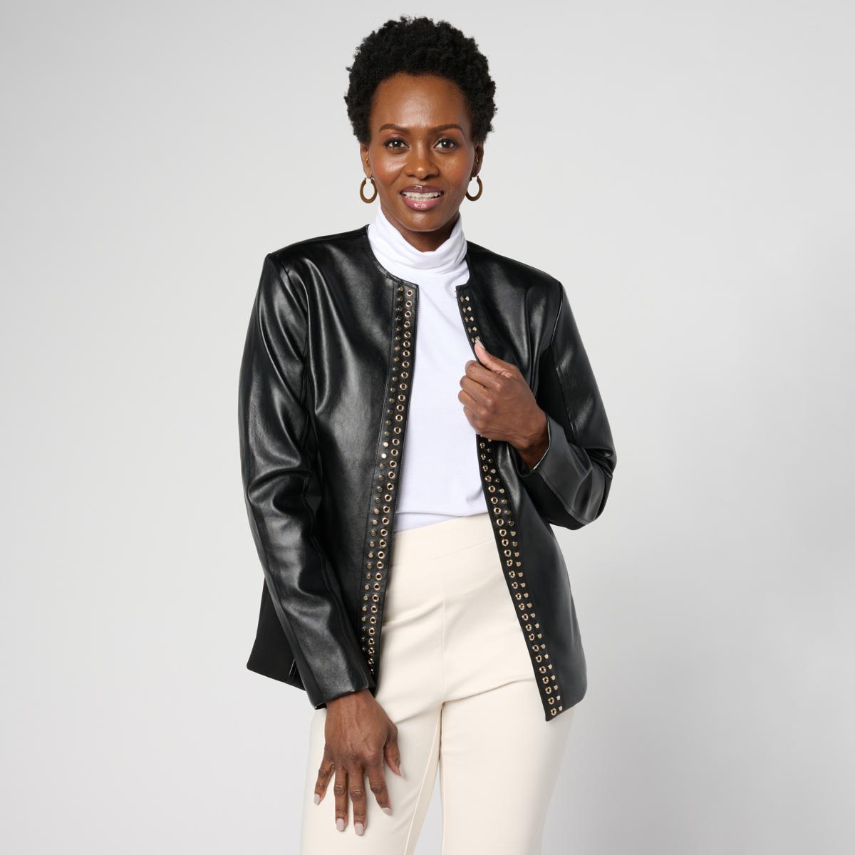 This sleek faux leather jacket features a modern knit combo at the side panels and under the sleeves for added comfort and style. With metal rivets and grommets along the front placket, it brings an edgy vibe to your spring wardrobe. Perfect for layering over your favorite tops, it offers a semi-fitted silhouette that moves with you.