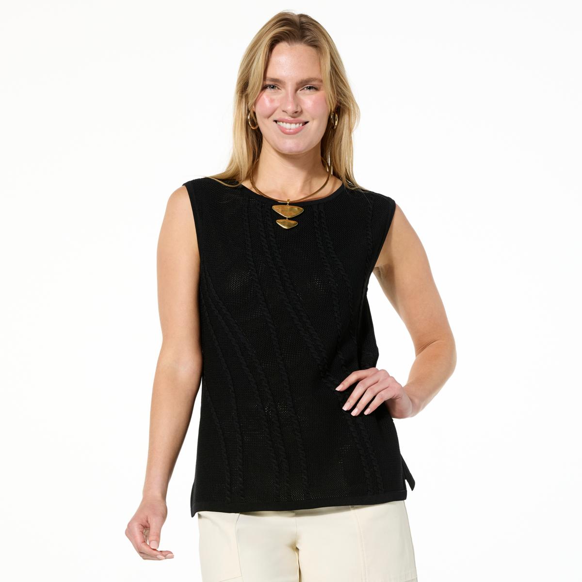 Build a timeless wardrobe with impeccable ease. This cable sweater knit sleeveless shell top inspires you to create layerable ensembles that are comfortable and effortless all year through.