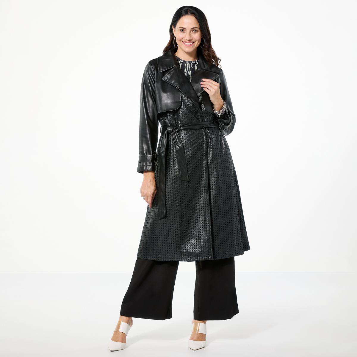 Upgrade your everyday outerwear with this sophisticated faux leather trench. Featuring perforated detail and flawless fit, this coat helps you step out in style.