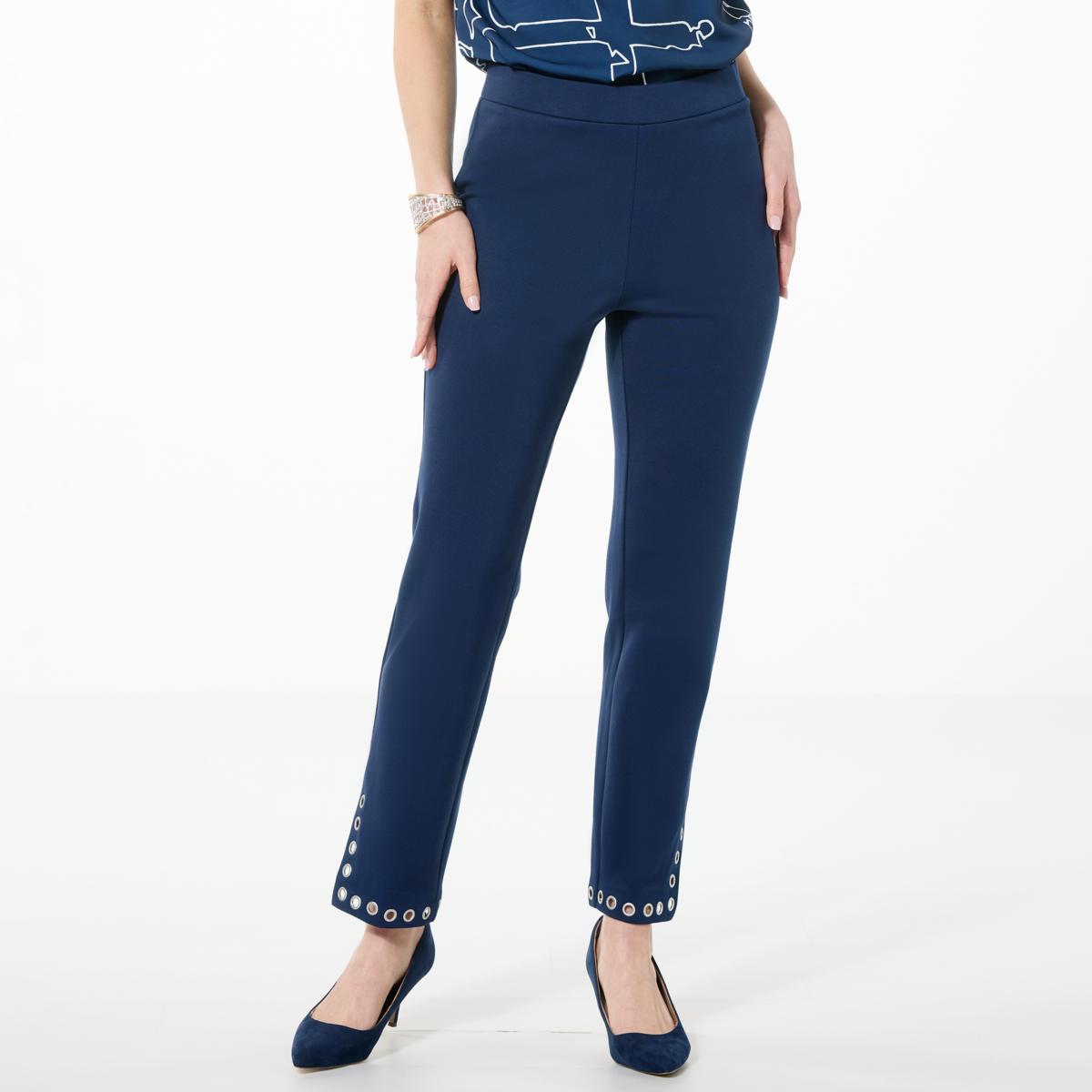 You'll stay comfortable and stylish all day long in our pull-on ponte knit pant, complete with grommet details! Perfect for any occasion from casual days out to nights on the town, these pants are guaranteed to elevate any outfit, any season.
