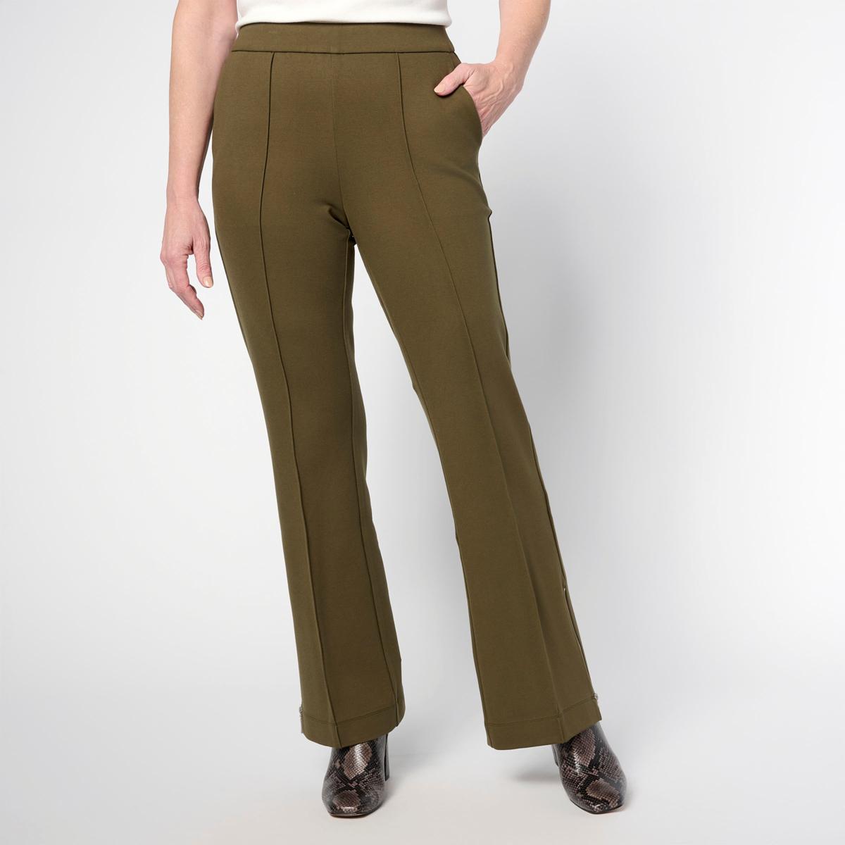 These pull-on pants feature a comfortable flat elastic waistband and a stylish flare leg with pintuck stitching down the center front. Functional side slash pockets and a metal zipper at the side leg hem add both practicality and a modern edge. Perfect for elevating your everyday look with ease and comfort.
