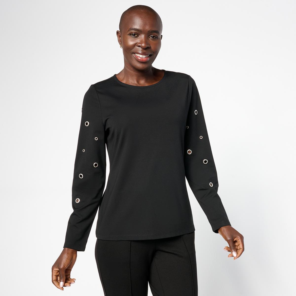 This lightweight double knit top features eye-catching grommet details that add a modern edge to your look. A classic crew neckline and long sleeves make it a versatile piece for layering or wearing solo. Perfect for elevating your everyday wardrobe with a touch of unique style.